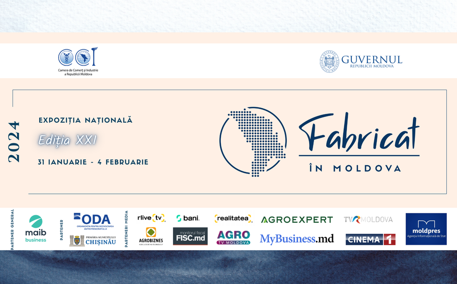 The Chamber of Commerce and Industry of the Republic of Moldova organizes the 21st edition of the National Exhibition “Made in Moldova”, which will take place at the International Exhibition Center “Moldexpo”, 1 Ghioceilor Str., Chisinau, between January 31 – February 4, 2024.